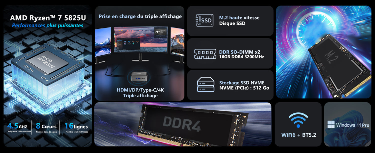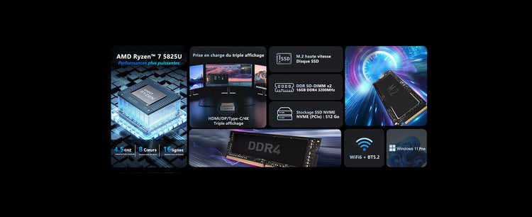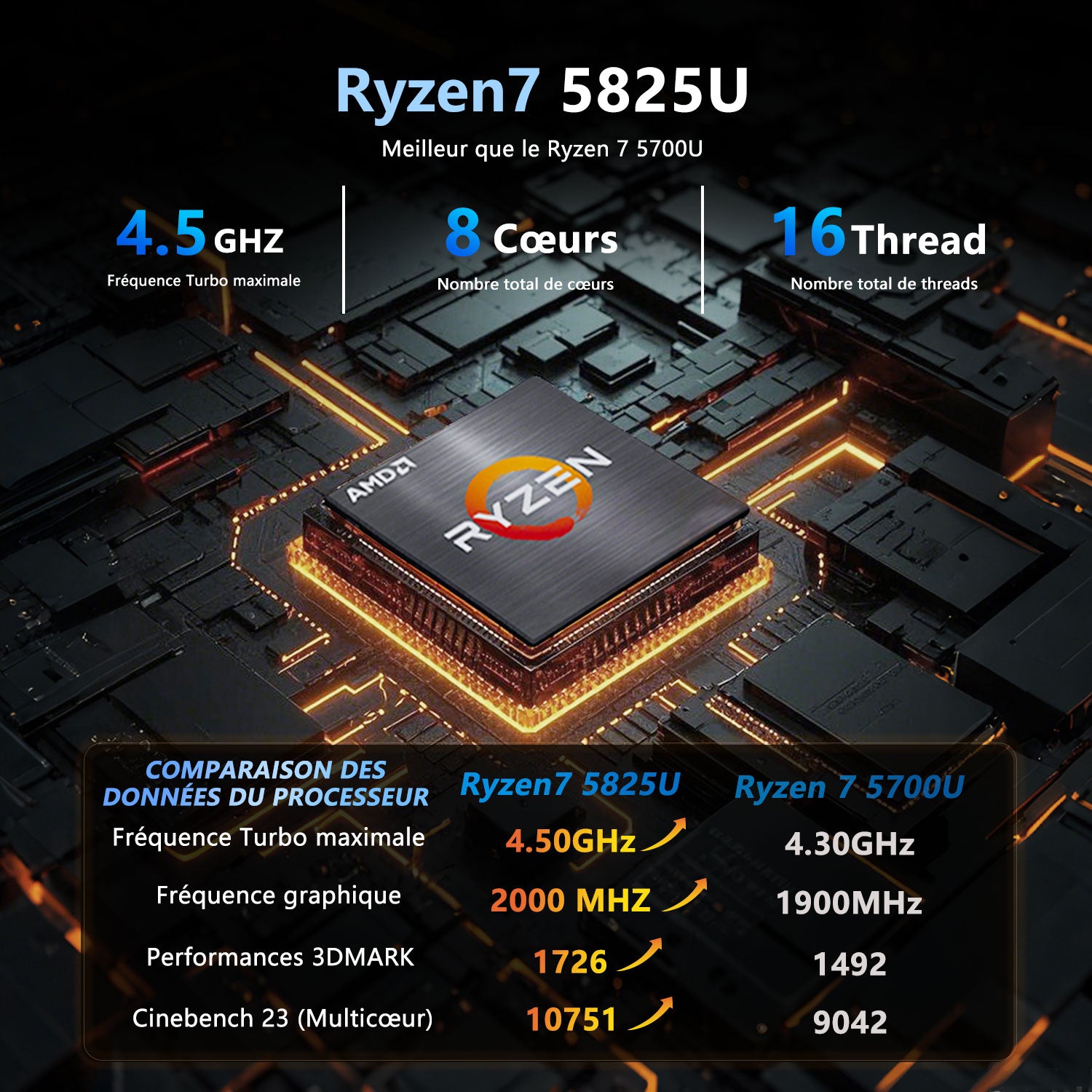 | Processeur | AMD Ryzen™ 7 5825U (8 cœurs 16 threads, 4.5 GHz, L2 4 Mo, L3 16 Mo) | Système | Windows 11 Pro est compatible avec Ubuntu et Linux. |