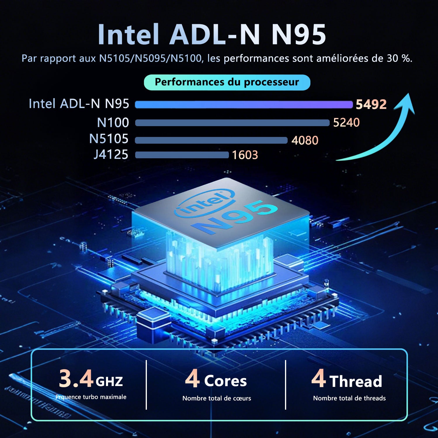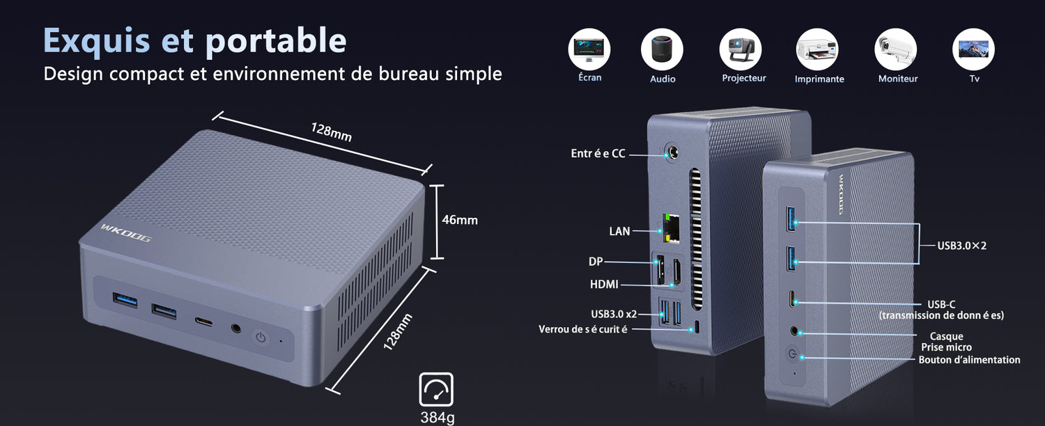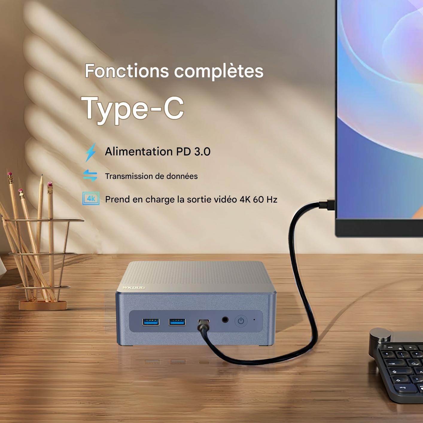 Le Mini K5 est un ordinateur compact et performant, conçu pour les utilisateurs en quête d'efficacité bureautique, de divertissement et de création légère. Sa configuration de base inclut un SSD M.2 2280 prenant en charge des vitesses de lecture et d'écriture élevées, améliorant considérablement la réactivité du système et l'efficacité des transferts de fichiers. Il gère facilement le démarrage du système, le chargement des logiciels et le traitement des fichiers volumineux. Équipé d'un processeur puissant et d'une carte graphique intégrée, le Mini K5 prend en charge le multitâche et offre un affichage fluide, répondant ainsi aux besoins quotidiens de bureautique, de divertissement audiovisuel et de création légère.