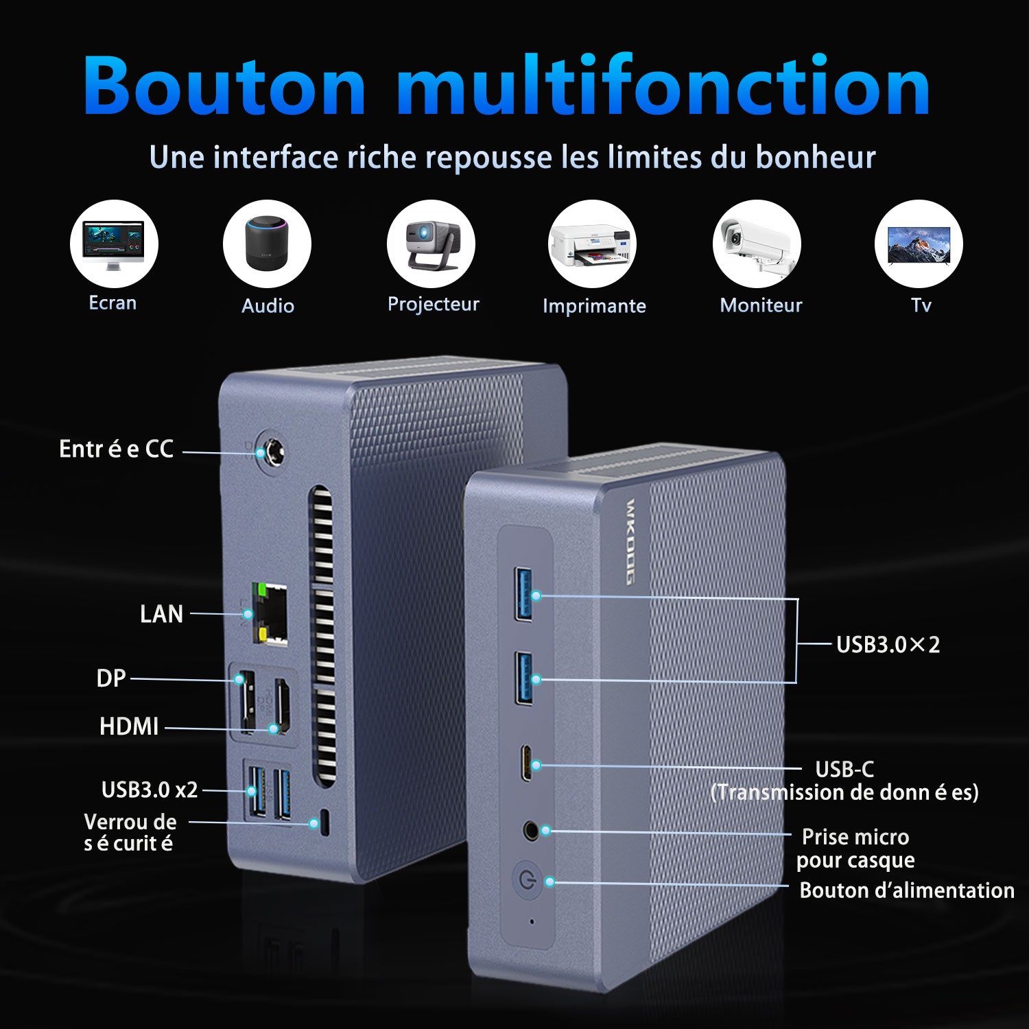 Vous cherchez un mini PC compact et puissant ? Ne cherchez plus, le K5 mini est fait pour vous ! Sa connectivité réseau est exceptionnelle. Compatible avec le Wi-Fi bi-bande 2,4 G et 5 G, il répond à tous vos besoins, que vous recherchiez un signal stable ou une connexion haut débit. Équipé d'un port réseau RJ45 LAN 1000 M, il répond parfaitement à vos besoins, que vous travailliez, étudiiez en ligne, regardiez des vidéos HD en streaming ou jouiez, en vous offrant une expérience réseau stable et haut débit.