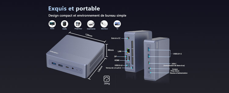 Connecteur d'alimentation DC Jack ¢5,5 mm*1, USB 3.0*4, RJ45 1000M*1, HDMI*1, DP*1(4K,60Hz), prise audio (HP&MIC)*1, données Type-C (USB 2.0)*1 |